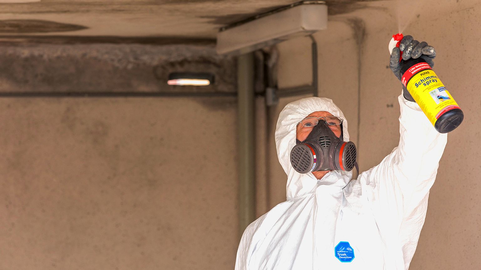 Alle Arbeiten sollten in einem Atemschutzgerät durchgeführt werden, um Schimmel nicht einzuatmen. Der Schimmel ist ja schädlich für die Gesundheit. Wenn Sie Chemikalien verwenden, müssen Sie nicht nur ein Atemschutzgerät, sondern auch Schutzhandschuhe tragen.